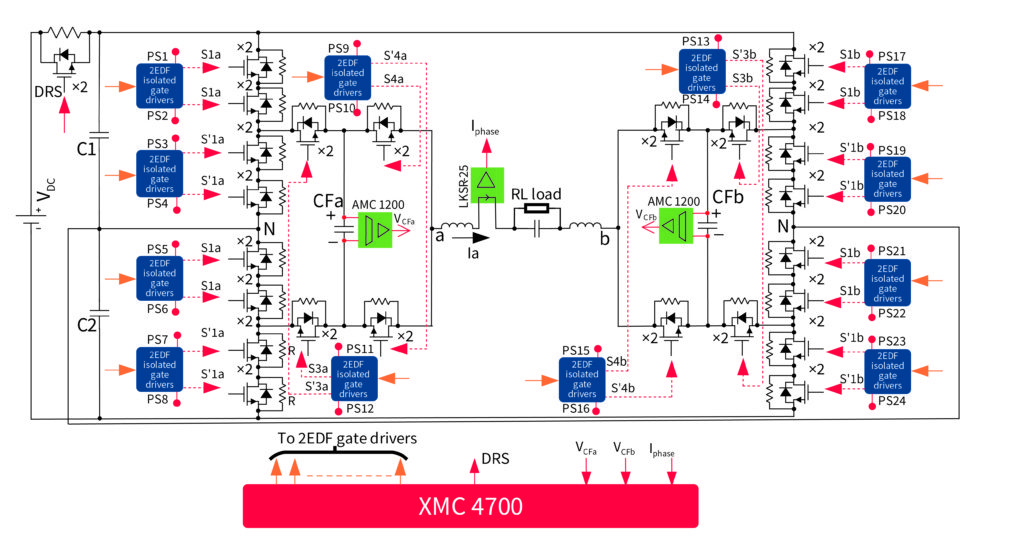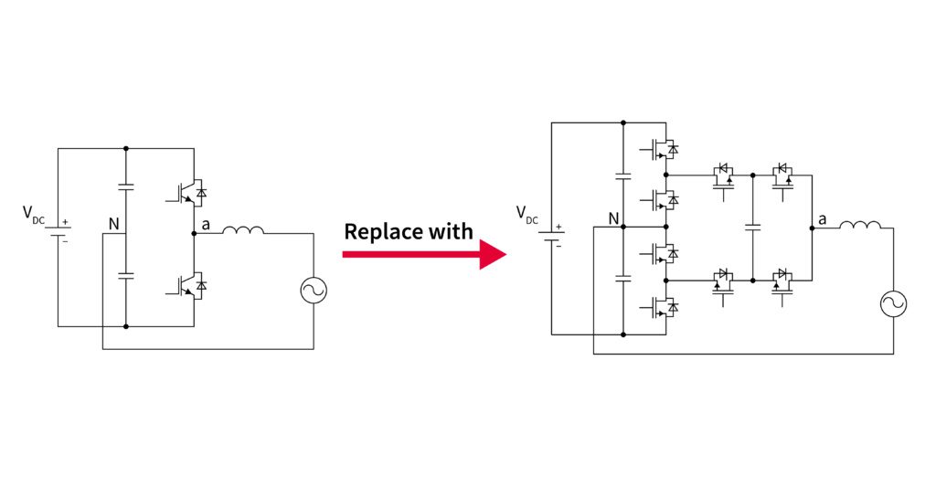 Bien qu’il soit plus facile de remplacer les dispositifs au silicium par des MOSFET SiC que de modifier la topologie de l’onduleur, cette approche n’améliore pas l’efficacité et la densité de puissance autant que l’approche multiniveau, ce qui signifie qu’un dissipateur thermique est toujours nécessaire aux niveaux de puissance inférieurs et qu’un refroidissement forcé peut s’avérer nécessaire aux niveaux de puissance supérieurs (> 5 kW). Bien qu’une topologie multiniveau soit plus complexe, elle peut offrir un rendement supérieur à 99 % et une densité de puissance élevée, ce qui justifie l’effort de conception.