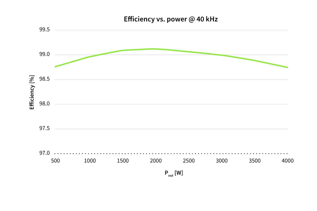La figure 5 montre l’efficacité de cette conception mesurée en fonction de la puissance de sortie. Il a atteint une efficacité maximale de 99,1 % à une puissance de sortie d’environ 2 kW. À pleine charge (4 kW), il a continué à fournir un rendement exceptionnellement élevé (98,7 %). Une carte thermique de la carte à pleine puissance de sortie a montré que la mesure de la température maximale des composants était inférieure à 85 ˚C. Ces chiffres d’efficacité et de température expliquent pourquoi cet onduleur multiniveau peut fonctionner en continu sans avoir recours à un dissipateur thermique ou à un ventilateur.