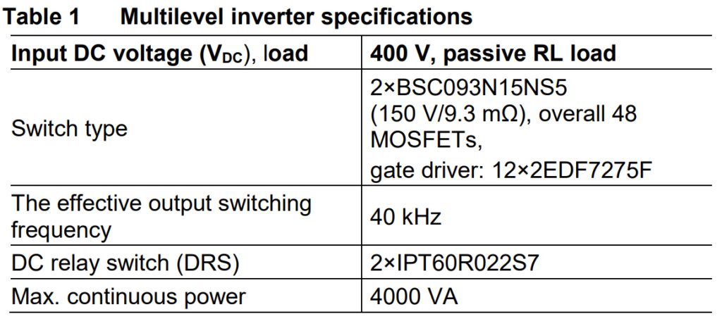 Pour étudier les performances de la topologie multiniveau proposée, Infineon a construit une carte de démonstration d’onduleur multiniveau monophasé de 4 kW, à cinq niveaux, basé sur des condensateurs volants, à point neutre actif et bridé (Figure 4) sur la base des spécifications de conception indiquées dans le tableau 1. L’avantage de cette conception multiniveau est qu’elle permet d’utiliser des MOSFETs OptiMOS 5 150 V 9,3 mΩ (BSC093N15NS5), même si la tension du bus est de 400 VDC.