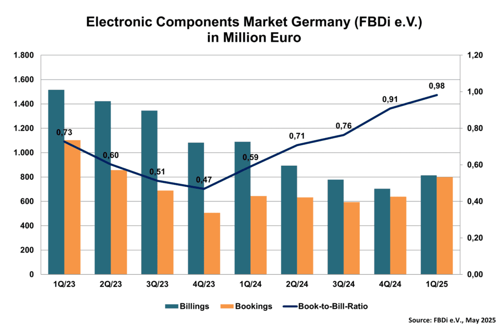 Selon l’association professionnelle FBDi, les ventes de composants électroniques via la distribution ont chuté de près de 25 % au premier trimestre 2025 par rapport au même trimestre de l’année précédente. Les prises de commandes sont légèrement positives, mais les perspectives restent modérées jusqu’au milieu de l’année, l’industrie espérant qu’il s’agit du début de la reprise.