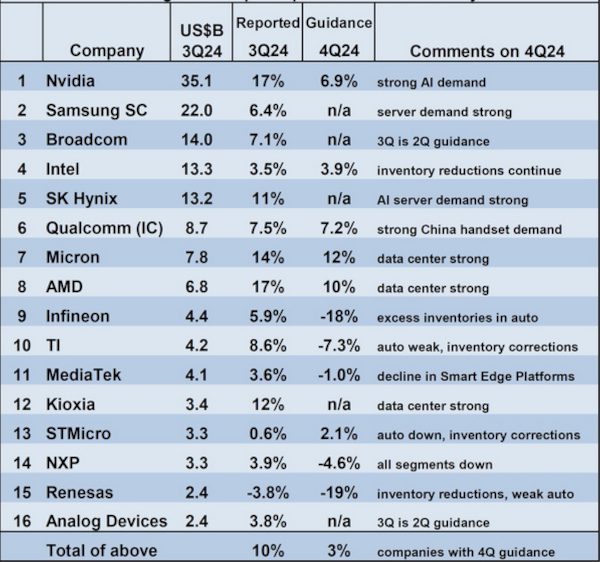 Le marché mondial des puces représentait 166 milliards de dollars au 3e trimestre 24, soit une hausse de 23,2 % par rapport au 3e trimestre 23, selon l’organisation World Semiconductor Trade Statistics (WSTS). Cependant, la moyenne pondérée des prévisions des principales entreprises de puces pour le 4T24 – lorsqu’elles sont disponibles – a été calculée à seulement 3 % par SC-IQ, avec une grande division entre les entreprises exposées à l’IA et aux applications des centres de données et celles exposées aux secteurs automobile et industriel.