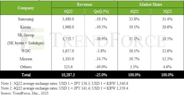 Ranking of NAND flash manufacturers by revenue 4Q22. Source: TrendForce