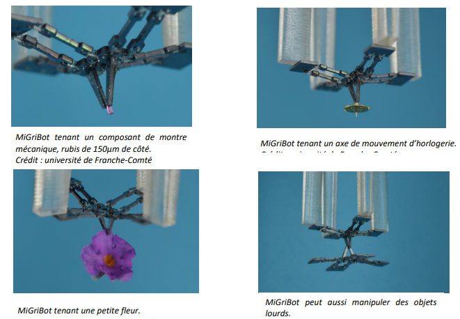 Un autre avantage de ce robot est que toutes ses mobilités, y compris la micro-pince qui est placée sur l’extrémité articulée, sont actionnées depuis la base du robot, rendant ses parties mobiles très légères. Enfin, sa structure robotique n’occupe qu’une surface de 20 x 20 mm2 . Ce niveau de compacité est obtenu en utilisant du silicium pour les éléments rigides, un polymère (polydiméthylsiloxane – PDMS) comme articulations souples et des actionneurs piézoélectriques dotés de capteurs de position. MiGriBot est donc plus léger, plus compact et plus rapide que les microrobots de manipulation déjà existants.