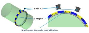 Moving Magnet Technologies a développé une solution magnétique innovante et simple qui consiste uniquement en un aimant de rotor et deux circuits intégrés de Hall 2D. Au cœur de cette technologie, on trouve un modèle de magnétisation sinusoïdal spécifique qui peut être répété sur plusieurs périodes. Ce principe confère déjà une excellente précision intrinsèque en tant que capteur à sonde unique ; toutefois, les exigences en matière de commande de moteur sont plus strictes que pour les applications traditionnelles, et la précision généralement requise est de ±1 degré électrique dans toutes les conditions. C’est là que le deuxième circuit intégré de Hall et une simple combinaison algébrique de signaux croisés entrent en jeu.