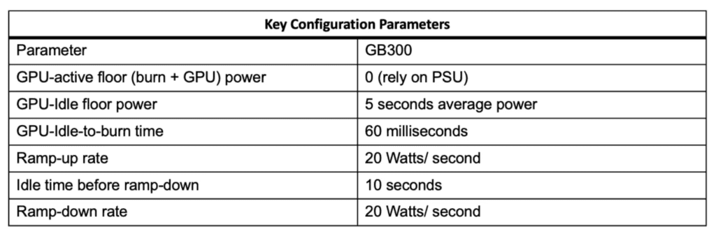 Pour le ralentissement, un algorithme logiciel qui détecte le moment où la puissance du GPU est ramenée à un niveau d’inactivité lorsque la puissance moyenne en cours d’utilisation diminue. Le pilote logiciel qui met en œuvre l’algorithme de lissage de la puissance engage le brûleur de puissance matériel. Le brûleur continue à utiliser une puissance constante en attendant que la charge de travail reprenne ; si la charge de travail ne reprend pas, le brûleur réduit progressivement la consommation d’énergie. Si la charge de travail du GPU reprend, le brûleur se désengage instantanément. Lorsqu’une charge de travail se termine, le brûleur réduit la consommation d’énergie à un rythme compatible avec les capacités du réseau, puis se désengage.