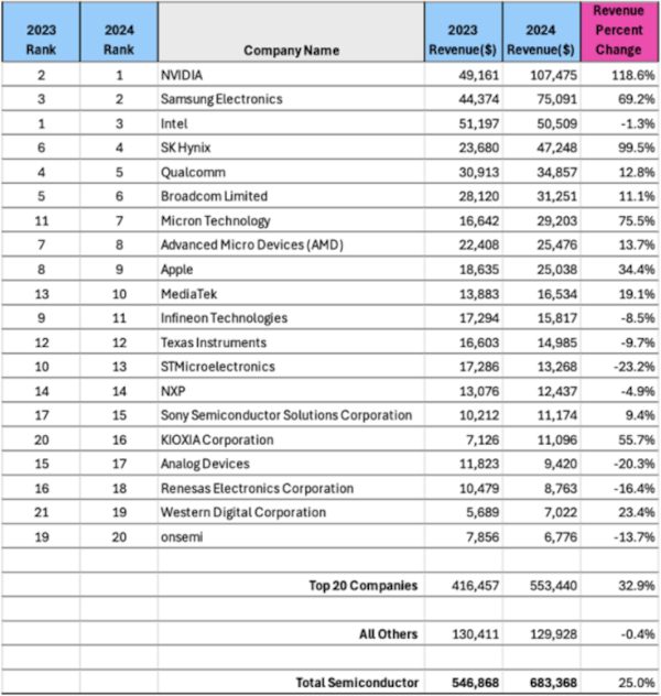 La demande de mémoire a stimulé les fabricants et a permis à Samsung, SK Hynix et Micron de figurer parmi les sept premiers en 2024.