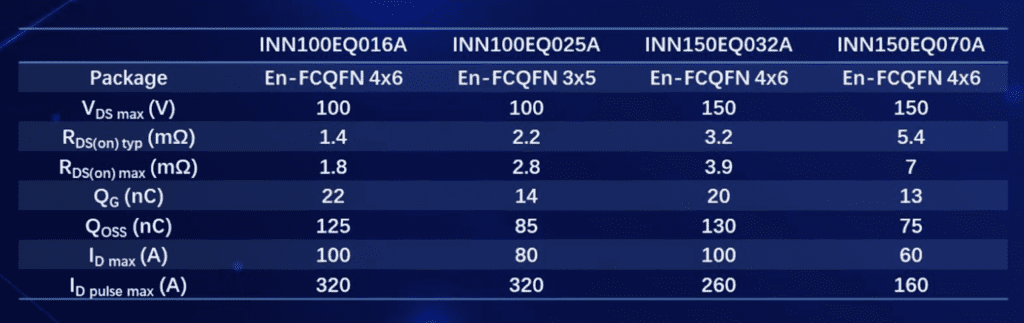 Les brochages des boîtiers INN100EQ 016A/1,8mΩ et 025A/2,8mΩ de 100V, ainsi que les dispositifs INN150EQ 032A/3,9mΩ et 070A/7,0mΩ de 150V sont compatibles avec les composants en boîtier à refroidissement par le desssous. Les transistors conservent également les caractéristiques de toutes les produits Innoscience : faible résistance, faible charge de grille, faible perte de commutation et faible charge de récupération inverse.